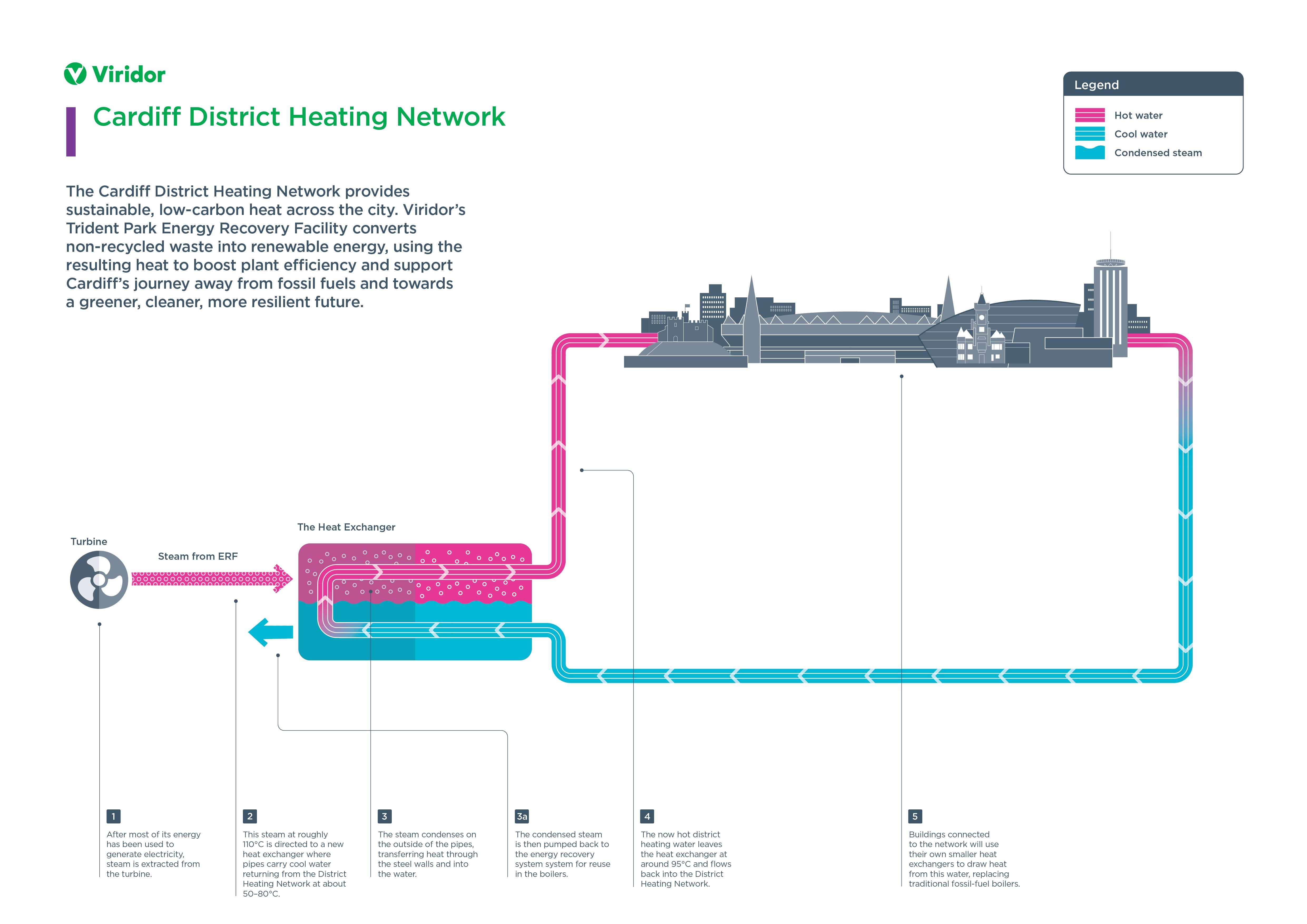 Steam produced during the process can be used in a heat network to provide heating and hot water to local homes and businesses via highly insulated pipes. When heat is used in this way it means that the ERF can be called a Combined Heat and Power (CHP) facility.